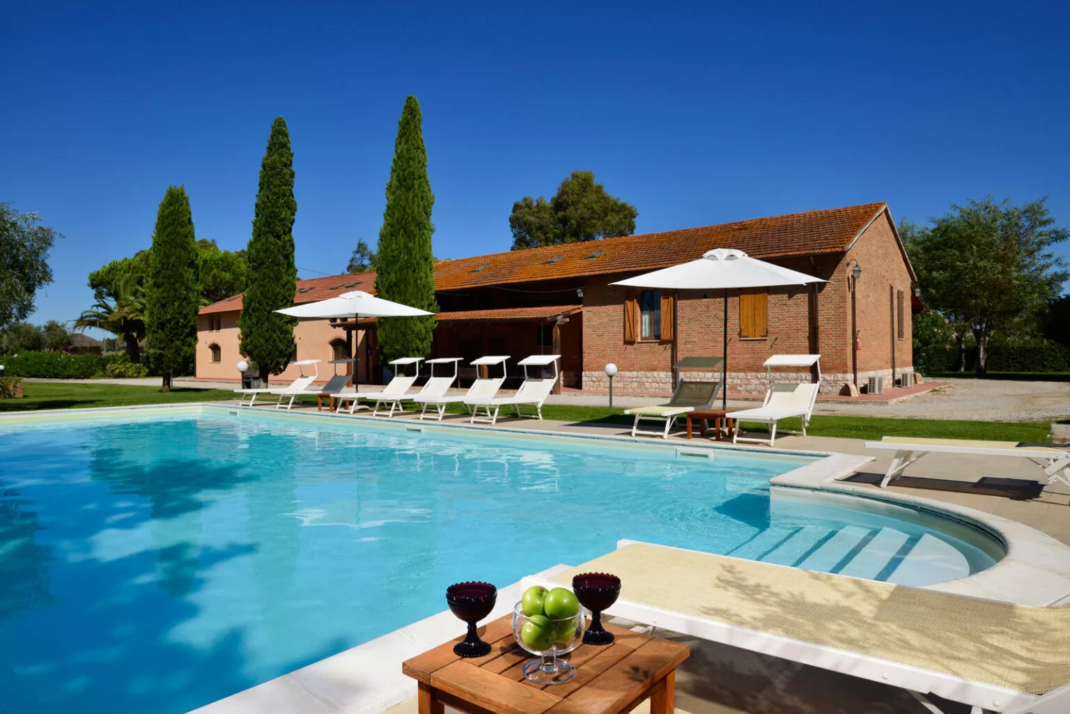 Dank der harmonischen Architektur, erreicht man das schöne, lang gestreckte Swimmingpool von jeder Stelle aus mit wenigen Schritten. Ringsrum liegen die weitläufigen Relax- und Dolce-Vita-Bereiche. Chaiselongues und Sofas laden zur Ruhe und Erholung ein, da der Sommer in diesem Teil der Maremma sehr lange andauert, mit ganzjährigem, milden und sonnigen Klima.